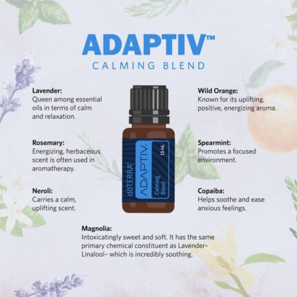 Când ai nevoie de ajutor pentru a te calma, blendul doTERRA Adaptiv e soluția. doTERRA Adaptiv este un amestec exclusiv care combină uleiuri esențiale de portocală sălbatică, levănțică, copaiba, mentă creață, magnolie, rozmarin, neroli și arbore de ampar. Levănțica are efecte calmante, iar portocala sălbatică binedispune. Păstrează doTERRA Adaptiv la îndemână pentru a te ajuta să te liniștești în medii sau situații noi. Folosește Adaptiv în combinație cu Adaptiv Touch pentru rezultate sinergice.