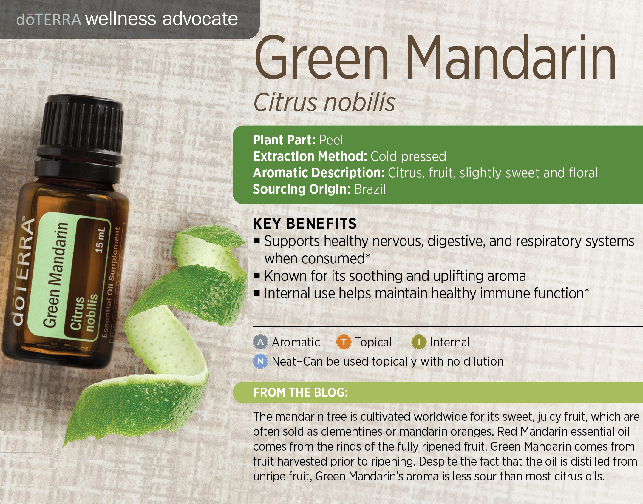 Presat din fructul necopt al mandarinului, uleiul esențial de mandarină verde este unic între uleiurile esențiale de citrice prin aroma și utilizările sale. La fel ca în cazul altor uleiuri de citrice, parfumul dulce și ușor floral al uleiului de mandarină verde este un mod minunat de a conferi un gust revigorant apei, salatelor și altor preparate!
