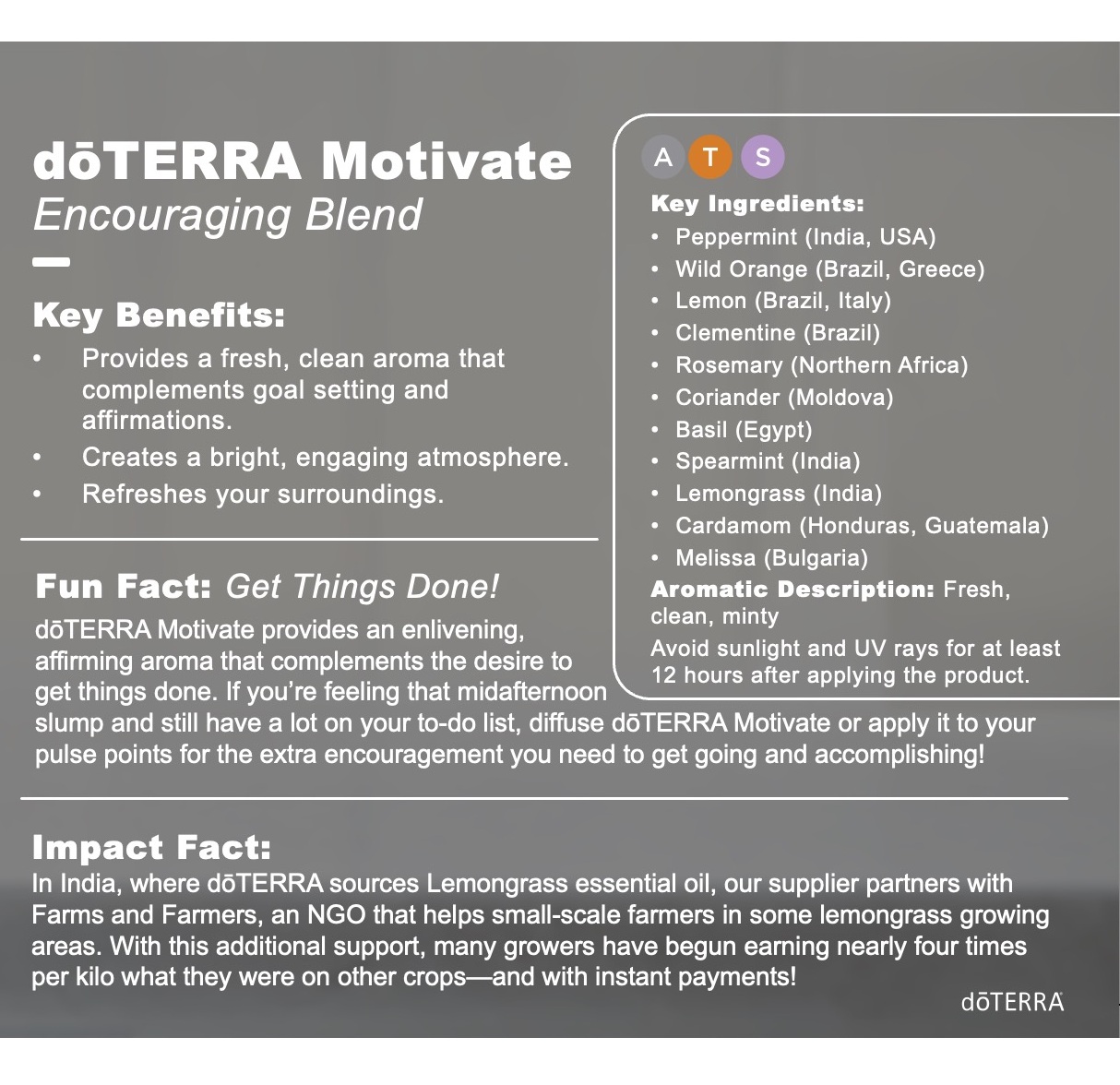 • Amestecul de uleiuri esențiale dōTERRA Motivate este formulat cu uleiuri care inspiră simțurile.
