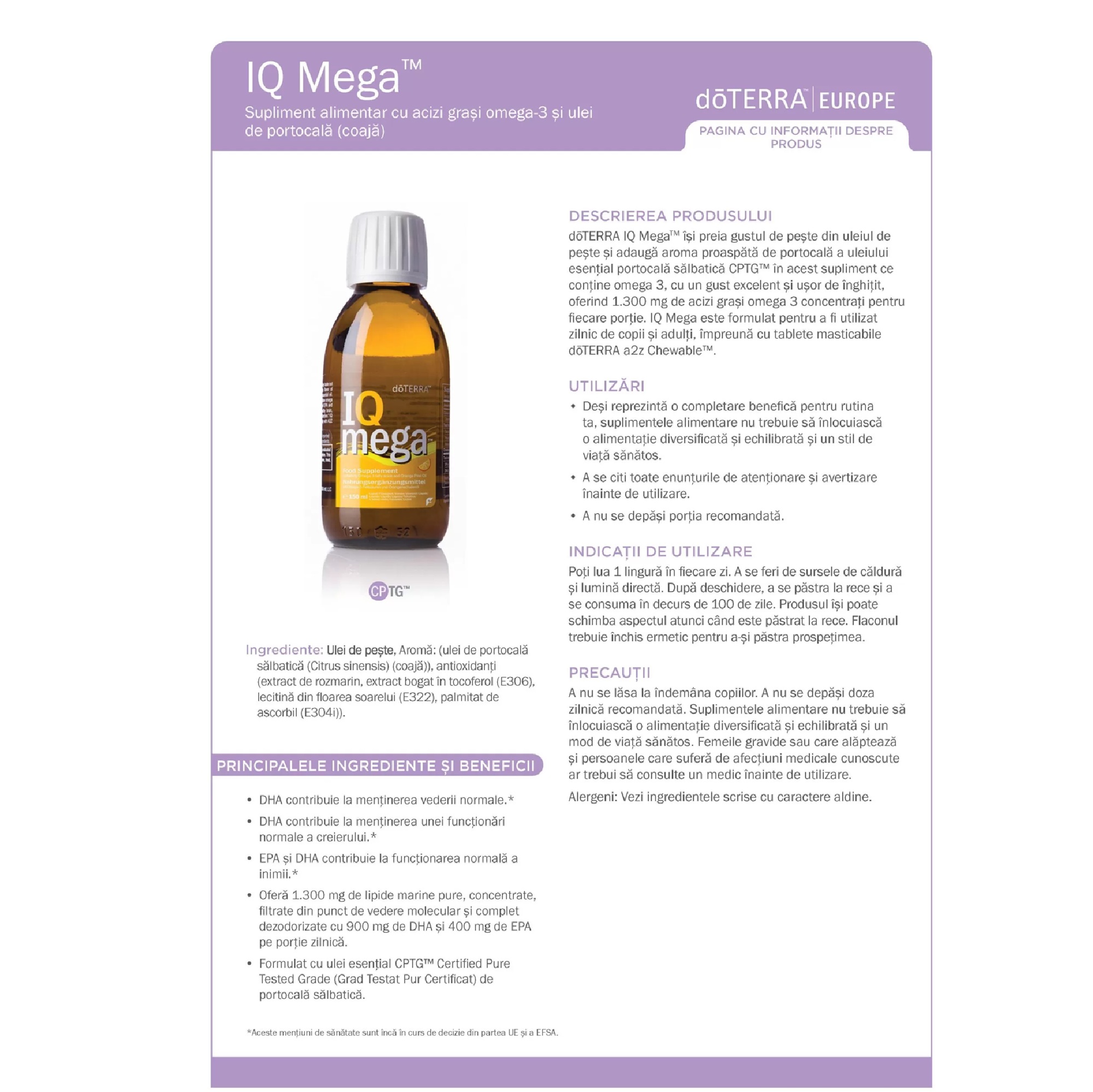 dōTERRA IQ Mega își preia gustul de pește din uleiul de pește și adaugă aroma proaspătă de portocală a uleiului esențial dōTERRA Portocală sălbatică CPTG™ în acest supliment ce conține omega 3, cu un gust excelent și ușor de înghițit, oferind 1.300 mg de acizi grași omega 3 concentrați pentru fiecare porție. IQ Mega este formulat pentru a fi utilizat zilnic de copii și adulți, împreună cu tablete masticabile dōTERRA a2z Chewable.