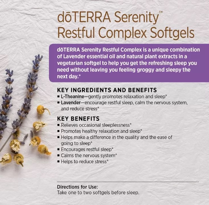 Complexul odihnitor doTERRA Serenity este o combinatie unica de ulei esential de levantica si extracte naturale din plante intr-o capsula vegetala, care te ajuta sa te bucuri de un somn reconfortant, fara senzatie de ameteala sau somnolenta a doua zi.